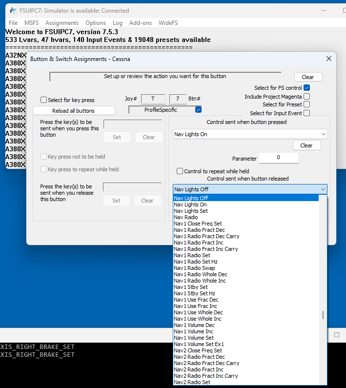 FSUIPC7 provides full control for all your button and switch assignments. These can be made general, applicable to all aircraft, or profile-specific, which means they only apply to a certain aircraft or group of aircraft. You can assign to both the button press and release events, and can have multiple assignments to each press/release.