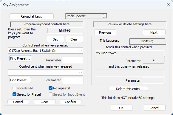Facilities are also provided for more complex assignments, where the assignment to a button or switch can be dependent on the state/position of another button or switch, or on the value of a simulator variable (simvar or lvar) held in an FSUIPC offset.